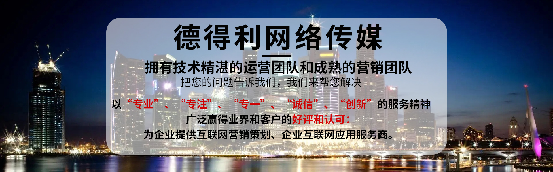 廣東德得利網(wǎng)絡(luò)傳媒有限公司是一家:為企業(yè)提供互聯(lián)網(wǎng)新媒體營(yíng)銷策劃、企業(yè)互聯(lián)網(wǎng)新媒體應(yīng)用服務(wù)商;以“專業(yè)、專注、專一、誠信、激情、敬業(yè)的服務(wù)精神,廣泛贏得業(yè)界和客戶的好評(píng)及認(rèn)可;這個(gè)時(shí)代,誰運(yùn)用好互聯(lián)網(wǎng)+新媒體誰將搶占先機(jī);擁有技術(shù)精湛的運(yùn)營(yíng)團(tuán)隊(duì)和成熟的營(yíng)銷團(tuán)隊(duì),團(tuán)隊(duì)成員曾任阿里巴巴內(nèi)部高管、營(yíng)銷專家、資深運(yùn)營(yíng)師、專業(yè)的DEB設(shè)計(jì)師和抖音內(nèi)部運(yùn)營(yíng)操盤手